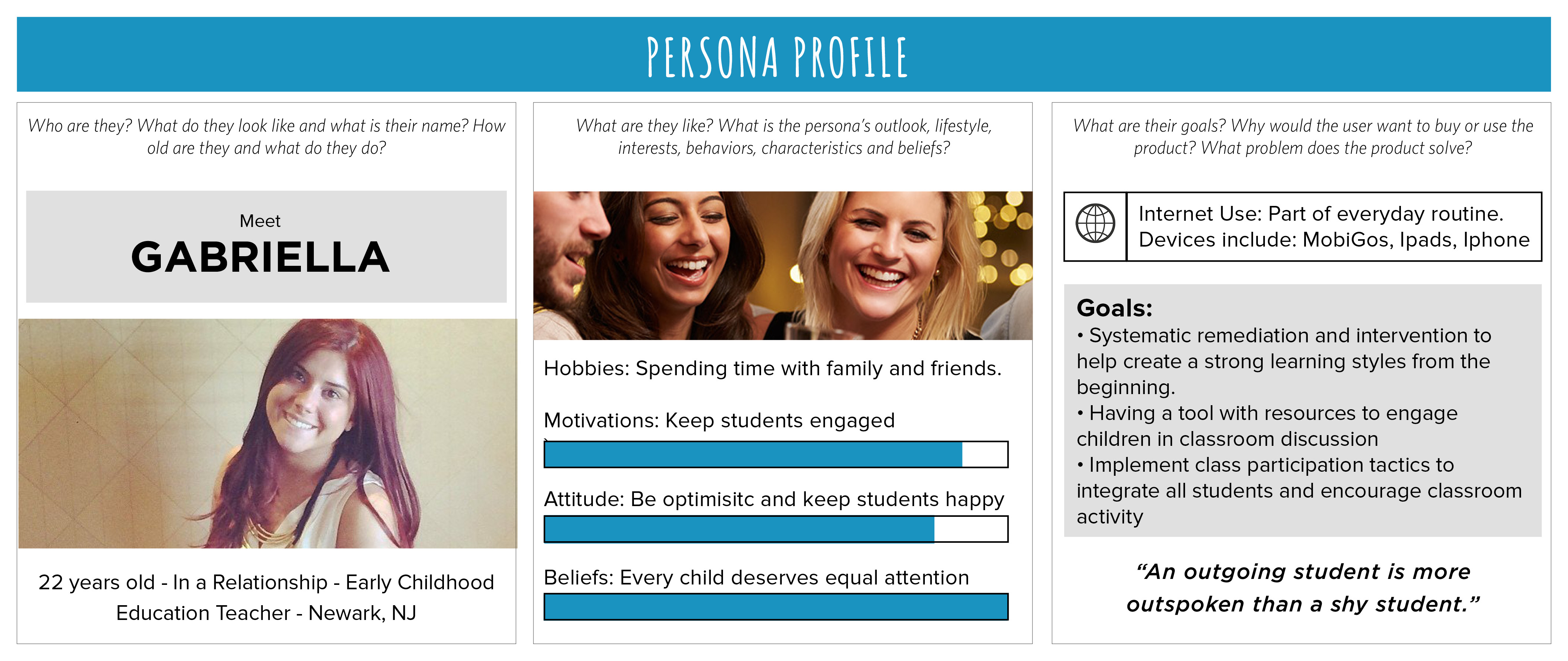 I created a UX journey for a teacher user through a persona profile and story. These were constantly used throughout the project to guide design decisions, priorities, and create empathy in the group.